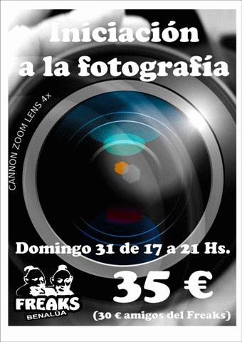 Como punto y final del mes, el domingo 31 de mayo de 17:00 a 21:00 h. el Freaks albergará un taller de iniciación a la fotografía, un curso intensivo para iniciarse en la fotografía digital. El curso, impartido por Maxi Velloso, se realizará en el interior del local y también en el exterior para realización de prácticas. Precio: general 35 €, amigos del Freaks 30 €.