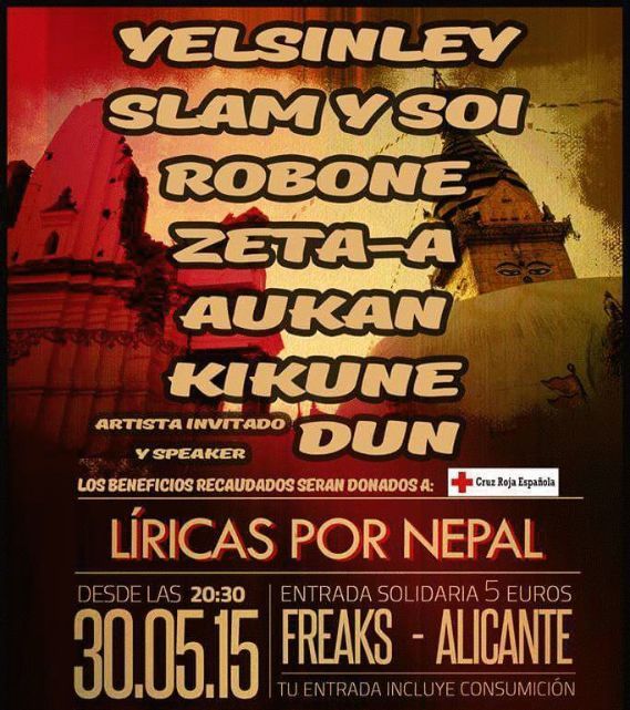 Mientras la atención mediática en torno al drama de Nepal decae, como en la mayoría de desastres naturales y conflictos pasadas las primeras semanas de la noticia, las enormes necesidades del pueblo nepalí se conservan intactas. El Freaks Arts Bar de Benalúa demuestra su sensibilidad hacia esta situación y acoge el sábado 30 de mayo a las 20:30 h. el Concierto Benéfico ‘Líricas por Nepal’, cuya recaudación irá destinada a Cruz Roja. La actuación correrá a cargo de los grupos Yelsinley, Slamysoi, Robone y Zeta-A, Aukan y contará con DUN como artista invitado y speaker. La entrada, con consumición mínima de cerveza, refresco o copa de vino, cuesta 5 €.
