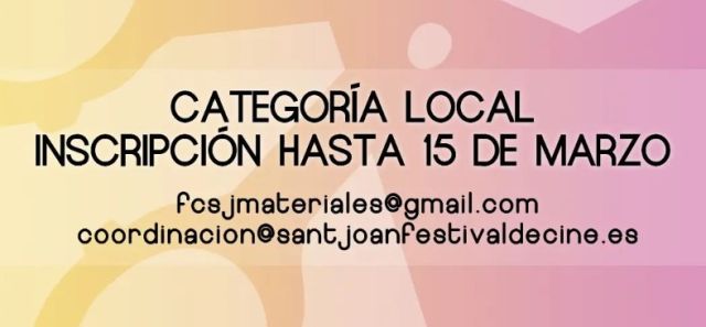 Para inscribir en la categoría local se ruega enviar un enlace de visionado (no descargable) y ficha técnica a solo uno de estos correos: coordinacion@santjoanfestivaldecine.es o fcsjmateriales@gmail.com