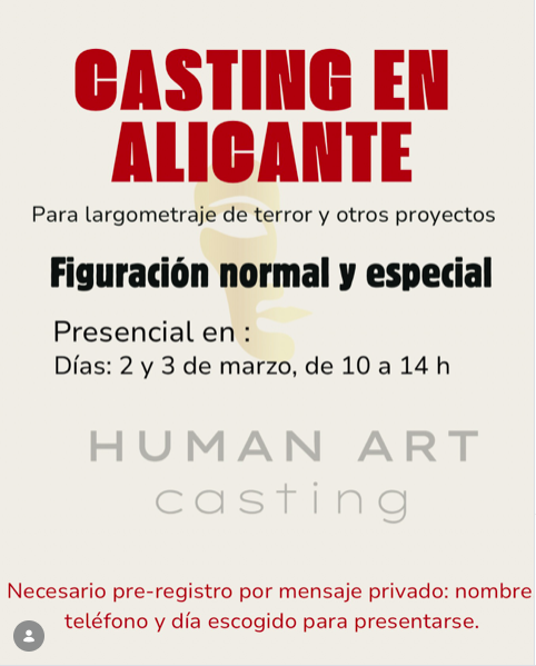 La agencia Human Art Casting, dirigida por Bárbara Barone, organiza un casting presencial los próximos 2 y 3 de marzo, de 10:00 a 14:00, en el Edificio Puerta Ferrisa (espacio municipal, Alicante), con el objetivo de seleccionar actrices y actores para pequeñas partes y unos 65 figurantes aproximadamente para un largometraje de terror en desarrollo, además de incorporar nuevos perfiles a su base artística de cara a varios proyectos publicitarios y de ficción previstos para 2026.
