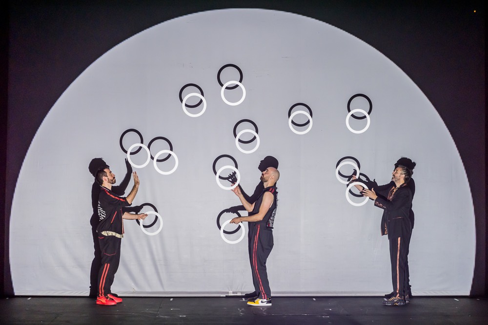 Pelotas que bailan al ritmo de Bach, aros simultáneos o una coreografía de manipulación con la canción ‘Sinnerman’ de Nina Simone son algunas de las imágenes que ofrece la representación de esta pieza de circo contemporáneo.