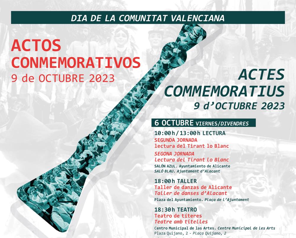 Dança, bailes populares y tradicionales, títeres, folclore y literatura centran las actividades de la celebración del 9 de Octubre en Alicante. La octava edición de la lectura pública del ‘Tirant lo Blanc’ abrió el jueves los actos conmemorativos. El vicealcalde Manuel Villar comenzó la lectura de los primeros capítulos, seguido de concejales de los distintos grupos políticos, representantes de la Universidad de Alicante (UA) y de diferentes asociaciones, alumnos de la UA, y de los institutos El Pla, de Alicante; y del Gaia (San Vicente del Raspeig). La segunda sesión de la lectura está programada para el viernes 6 de octubre, a partir de las 10 horas, en el Centro Municipal de las Artes. Intervendrán alumnos de los institutos alicantinos ‘Jorge Juan’ y ‘Miguel Hernández’.
