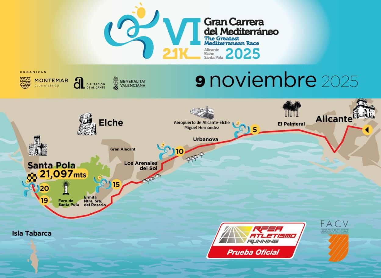 Media maratón, brisa marina y kilómetros de historia. Así se presenta la VI Gran Carrera del Mediterráneo 21K, que el domingo 9 de noviembre de 2025, a partir de las 9:00 h., conectará Alicante con Santa Pola a lo largo de un trazado espectacular que recorre playas, palmerales y zonas urbanas frente al mar.