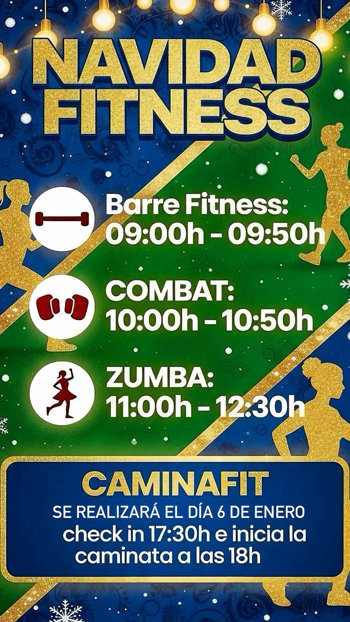 De este modo, el domingo 4 de enero se mantiene íntegramente la sesión matinal al aire libre, que arrancará a las 9.00 horas con una clase de Barre Fitness, seguida de Combat entre las 10.00 y las 10.50 horas. La mañana se cerrará con una amplia sesión de Zumba, de 11.00 a 12.30 horas, en el entorno habitual de la Explanada.