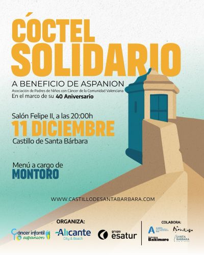 Alicante prepara una velada donde gastronomía, solidaridad y patrimonio se dan la mano. El próximo 11 de diciembre, el Castillo de Santa Bárbara abrirá las puertas del Salón Felipe II para celebrar una Cena-Cóctel Solidaria a beneficio de Aspanion, la asociación que acompaña a niños y adolescentes con cáncer y a sus familias en la Comunidad Valenciana. La iniciativa, promovida por el Patronato de Turismo Alicante City&Beach, Grupo Esatur y Catering Montoro, se enmarca en la programación de Alicante Capital Española de la Gastronomía 2025 y nace con voluntad de continuidad.
