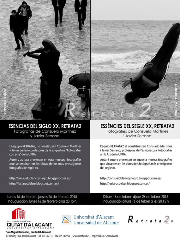 nspirada en obras de prestigiosos fotógrafos y fotógrafas del siglo XX, llega a la Sede Ciudad de Alicante la exposición fotográfica “Esencias del siglo XX” que expone un nuevo trabajo del equipo Retrata2, integrado por Consuelo Martínez y Javier Serrano. La muestra se inaugura el lunes 16 de febrero a las 20:15 horas y permanecerá abierta al público hasta el día 26.