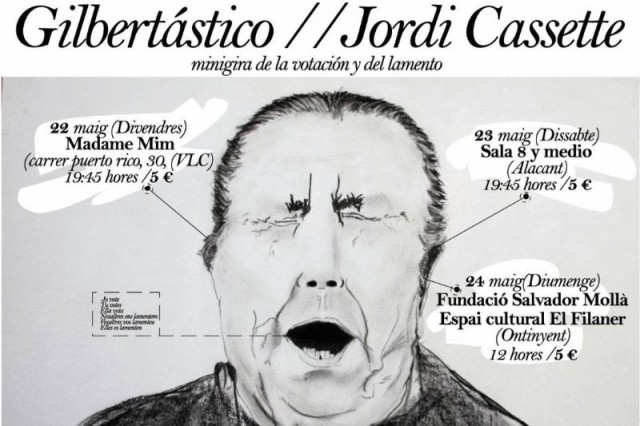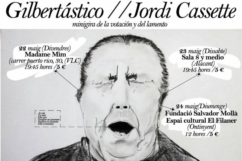 ilbertástico y Jordi Cassette se han embarcado en una mini gira que se ha venido a denominar ‘de la Votación y del Lamento’ y que, en plena jornada de reflexión, tras su paso por Valencia llega el sábado 23 de mayo a la sala Ocho y Medio de Alicante, «lugar ideal para la conjura musical que se está tejiendo en la sombra…», aseguran. La cita alicantina dará comienzo a las 19:45 h., y las entradas pueden adquirirse por 5 € («donación de campaña»).