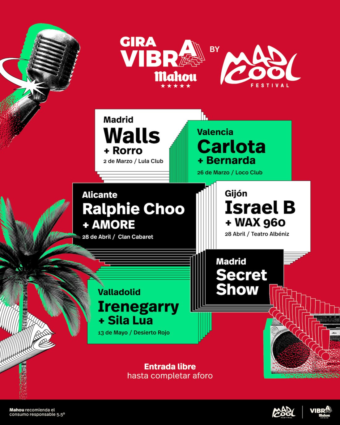 Este verano volverá la esperada temporada de grandes festivales como Mad Cool Festival, que cada año da cita a cientos de fans. Para amenizar la espera hasta que una nueva edición del festival abra sus puertas, Mad Cool Festival y Vibra Mahou, la plataforma de música de Mahou Cinco Estrellas que impulsa encuentros en torno al directo, presentan la tercera edición de la Gira Vibra Mahou by Mad Cool Festival, un tour compuesto por cinco conciertos que llevarán toda la esencia del festival a las salas de cinco capitales españolas.